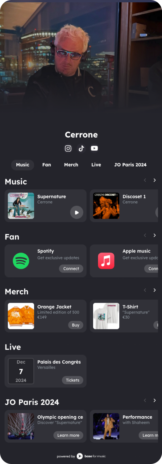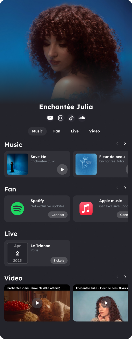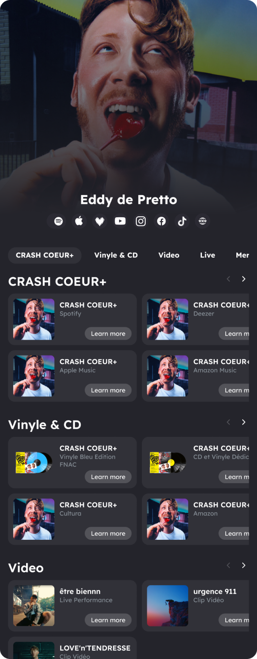 All your work, one free link. Showcase your music, videos, events, and merch with a sleek minisite that's easier to use and more powerful than Linktree. Connect with your fans effortlessly and keep them engaged with your latest updates.